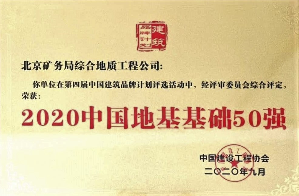 9月29日,北京礦務局綜合地質工程公司在第四屆中國建筑品牌評選活動中,被中國建設工程協會、中國建筑品牌發展計劃工作委員會評定為“2020年中國地基基礎50強”,并頒發了榮譽證書,對公司一年來的付出與貢獻給予了充分肯定。