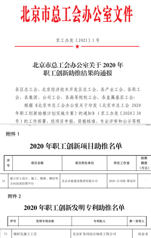 2021年1月15日,北京市總工會辦公室發布《關于2020年職工創新助推結果的通報》(京工辦發[2021]1號),京能地質公司工會申報的兩項職工科技創新項目獲得助推資金支持。